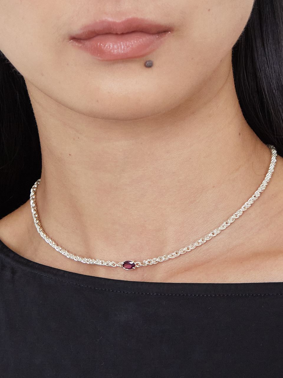 • 볼륨감 있는 체인에 로돌라이트 가넷을 세팅한 반지